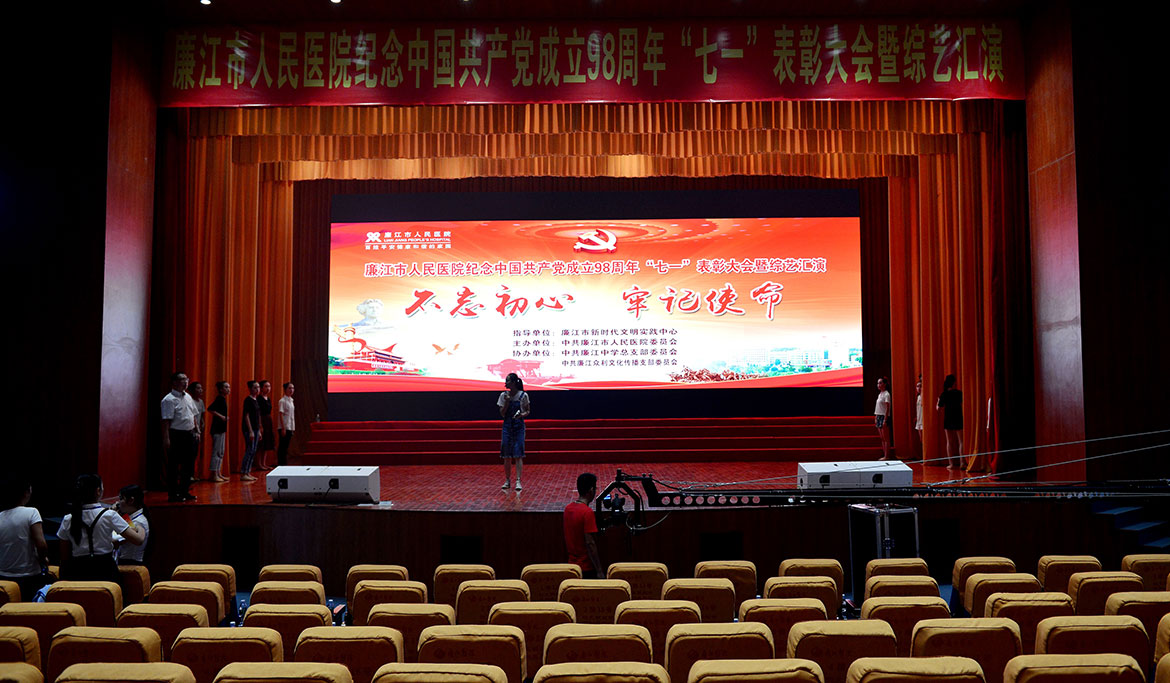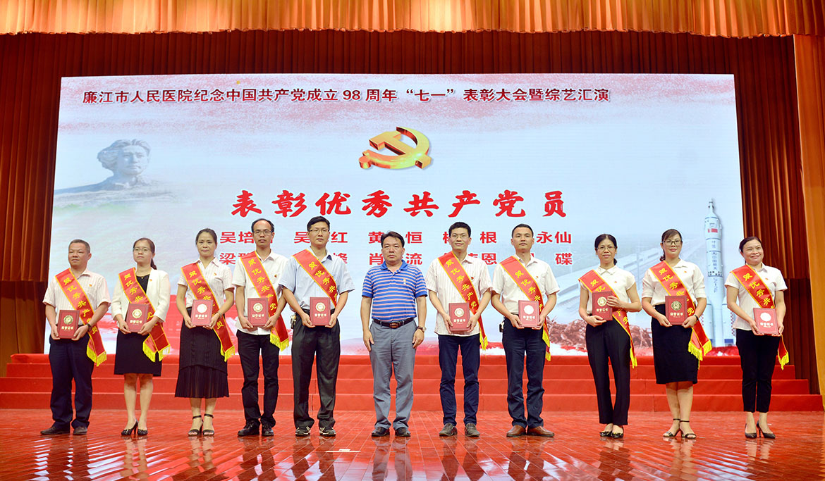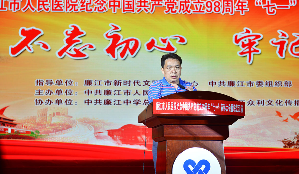 6月28日晚,人民醫院在廉江劇院舉辦“不忘初心,牢記使命”紀念中國共產黨成立98周年“七一”表彰大會暨綜藝匯演晚會。市人大常委會主任、黨組書記李世東,市委常委、市政府黨組成員木聲隆,市人大常委會黨組副書記、常務副主任、市總工會主席李玲,市政協副主席、黨組成員陳亞德,市政協副主席林炳坤,市政協副主席王麗峰等領導應邀參加觀看演出和頒獎活動,市婦聯、團市委、人社局、衛健局、醫保局、交通局、檢察院、法院、財政局、廉江中學、廉江衛校等單位領導應邀參加觀看演出。