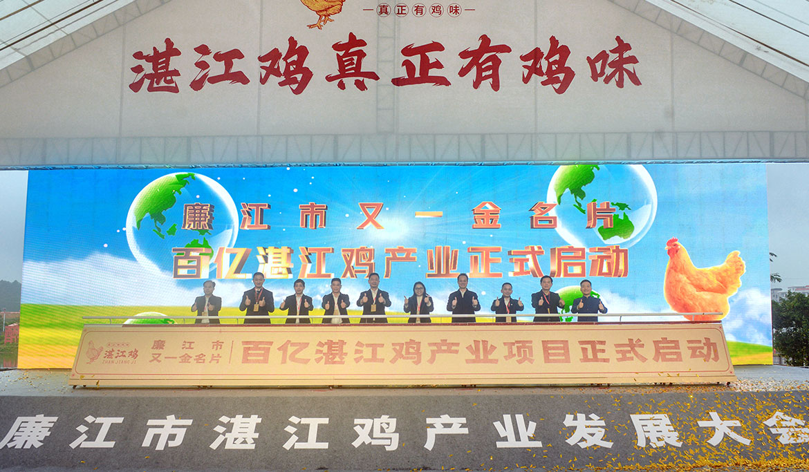 湛江市人大常委會(huì)副主任李雄光,華南農(nóng)業(yè)大學(xué)科學(xué)研究院院長(zhǎng)謝青梅,湛江市農(nóng)業(yè)農(nóng)村局局長(zhǎng)莫植貴,湛江市商務(wù)局局長(zhǎng)張佩,湛江市市場(chǎng)監(jiān)督管理局總工程師葉國(guó)琳,廉江市委書記陳恩才,市委副書記、市長(zhǎng)柯俊,市人大常委會(huì)黨組書記、主任陳煒飛,市政協(xié)黨組書記、主席吳永光,廣東振遠(yuǎn)文化集團(tuán)董事長(zhǎng)梁振運(yùn),為廉江市百億湛江雞產(chǎn)業(yè)項(xiàng)目啟動(dòng)推桿。